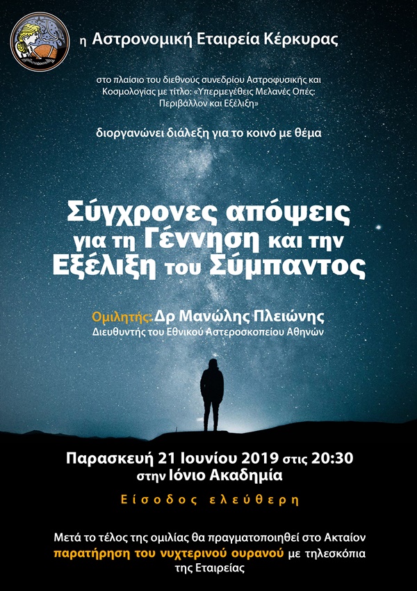 Η Αστρονομική Εταιρεία Κέρκυρας στο πλαίσιο του διεθνούς συνεδρίου Αστροφυσικής και Κοσμολογίας με τίτλο «Υπερμεγέθεις Μελανές Οπές: Περιβάλλον και Εξέλιξη» διοργανώνει διάλεξη για το κοινό με θέμα: «Σύγχρονες απόψεις για τη Γέννηση και την Εξέλιξη του Σύμπαντος»