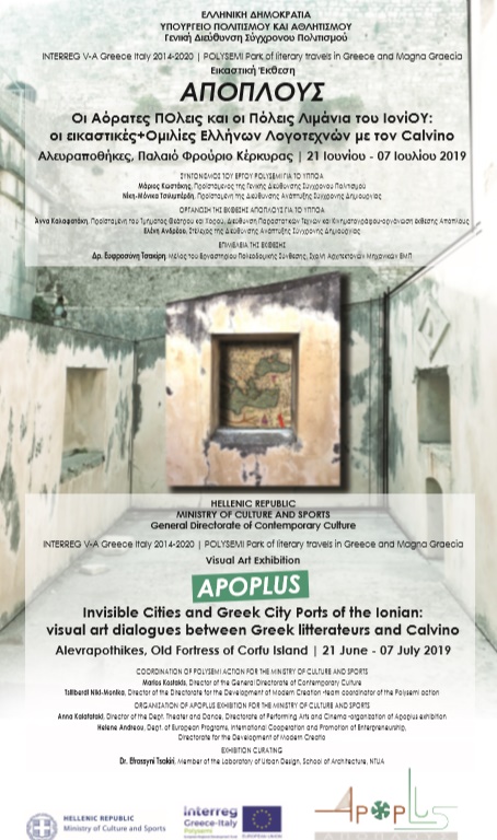 “Οι Αόρατες ΠΟλεις και οι Πόλεις Λιμάνια του ΙονίΟΥ: οι εικαστικές +Ομιλίες Ελλήνων Λογοτεχνών με το Calvino” στις Αλευραποθήκες, του Παλαιού Φρουρίου Κέρκυρας που διοργανώνεται από την Γενική Διεύθυνση Σύγχρονου Πολιτισμού του Υπουργείου Πολιτισμού και Αθλητισμού στο πλαίσιο του έργου Polysemi του Ευρωπαϊκού Προγράμματος INTERREG Ελλάδα-Ιταλία 2014-2020, υπό την επιμέλεια και επιστημονική τεκμηρίωση της Δρ. Ευφροσύνης Τσακίρη, μέλος τους Εργαστηρίου Πολεοδομικής Σύνθεσης Σχολής Αρχιτεκτόνων Μηχανικών ΕΜΠ.