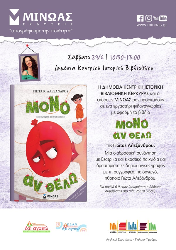 H Δημόσια Κεντρική Ιστορική Βιβλιοθήκη Κέρκυρας και οι Εκδόσεις ΜΙΝΩΑΣ διοργανώνουν εργαστήρι φιλαναγνωσίας με αφορμή το βιβλίο “Μόνο αν θέλω” της Γιώτας Αλεξάνδρου.