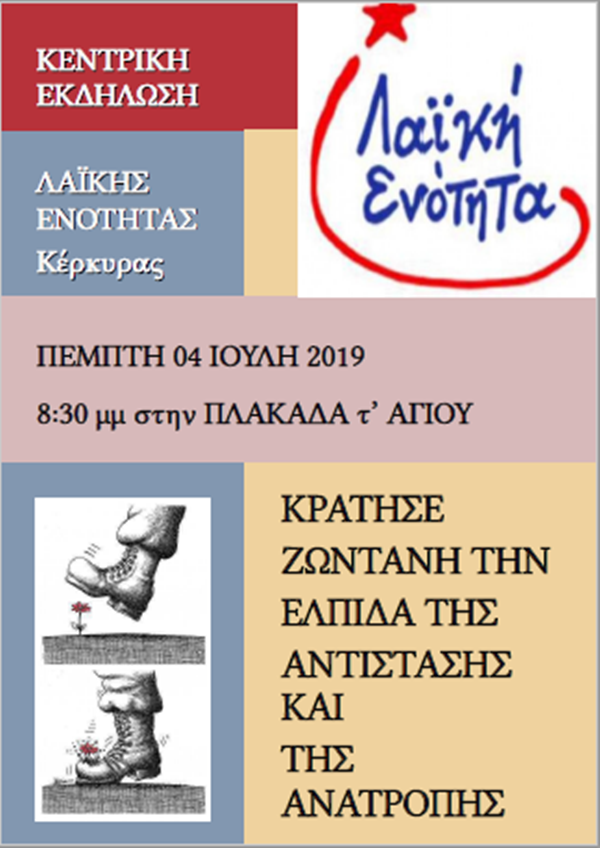 Με σύνθημα “κράτησε ζωντανή την ελπίδα της αντίστασης και της ανατροπής”, η ΛΑΕ θα πραγματοποιήσει την Πέμπτη το βράδυ, στις 8.30, την κεντρική προεκλογικής της συγκέντρωση στην Πλακάδα τ’ Αγιού.