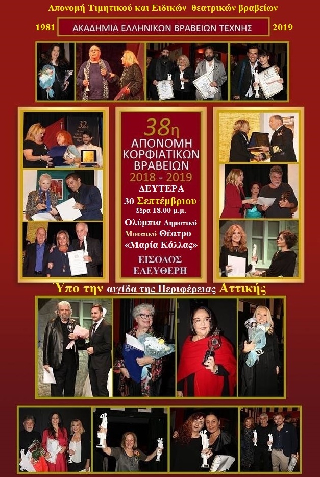 Η οργανωτική επιτροπή της 38ης απονομής των Κορφιάτικων θεατρικών βραβείων 2018-2019 και μετά από την έγκριση του Προέδρου και ιδρυτού της Ακαδημίας Ελληνικών Βραβείων Τέχνης, Δημήτρη Μουζακίτη, δίνει στη δημοσιότητα τα ονόματα των τιμητικών και ειδικών επάθλων για το 2018-2019.