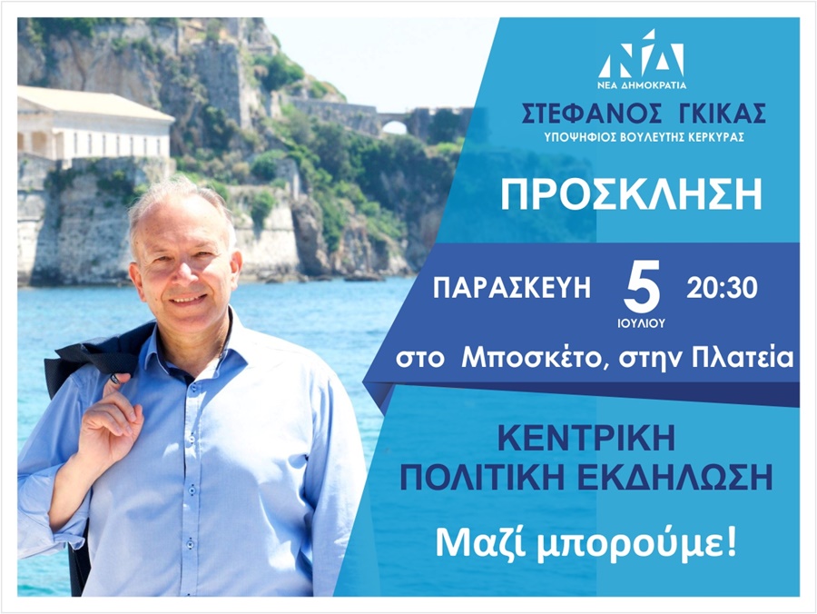 «Με μεγάλη χαρά σας προσκαλώ στην Κεντρική Πολιτική μου Εκδήλωση, την Παρασκευή 5 Ιουλίου 2019, στις 8.30 το βράδυ στο Μποσκέτο, στην Πλατεία.