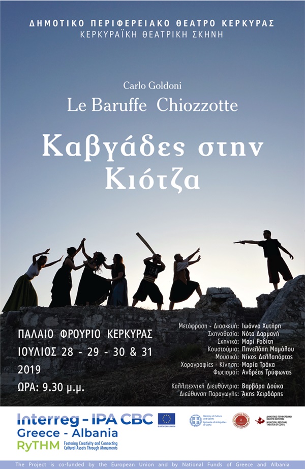Το ΔΗ. ΠΕ. ΘΕ. Κέρκυρας ως εταίρος του έργου διασυνοριακής συνεργασίας RyTHM του Ευρωπαϊκού προγράμματος INTERREG- IPA CBC- ΕΛΛΑΔΑ –ΑΛΒΑΝΙΑ, θα παρουσιάσει στο Παλαιό Φρούριο Κέρκυρας, στην κορυφή του προμαχώνα SAVORGNAN-Πυριτιδαποθήκη, την Kυριακή 28, Δευτέρα 29, Τρίτη 30 και Τετάρτη 31 Ιουλίου 2019 – ώρα 21.30 το θεατρικό έργο – κωμωδία του G. Goldoni «Καυγάδες στην Κιότζα», με ανάδοχο την ΚΕΡΚΥΡΑΪΚΗ ΘΕΑΤΡΙΚΗ ΣΚΗΝΗ. Η μετάφραση από τη Βενετσιάνικη στην Κερκυραϊκή διάλεκτο και η ελεύθερη διασκευή του έργου μεταφέρουν με γλαφυρό τρόπο την εποχή και τη δράση του έργου στο νησί μας.