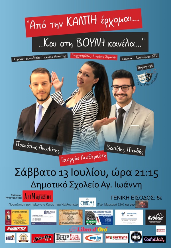 Η πιο αστεία, ή πιο ξεκαρδιστική σατυρική μετ’ εκλογική κωμωδία του καλοκαιριού παρουσιάζεται το Σαββάτο 13 Ιουλίου και ώρα 21:15 στο προαύλιο χώρο του δημοτικού σχολείου Αγίου Ιωάννη.