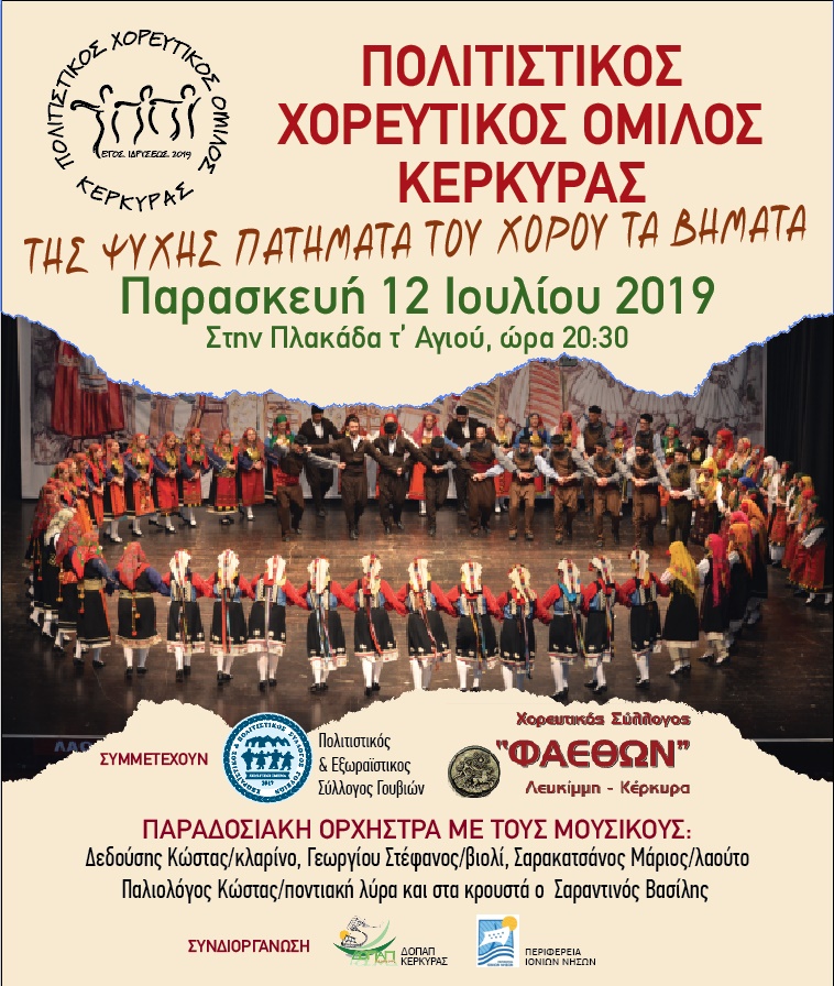 Ο Πολιτιστικός Χορευτικός Όμιλος Κέρκυρας για το κλείσιμο της χορευτικής του χρονιάς διοργανώνει χορευτική παράσταση στο ιστορικό κέντρο της πόλης της Κέρκυρας, στην πλακαδα του Άγιου, στις 12 Ιουλίου και ώρα 20.30 με τον τίτλο “της ψυχής πατήματα, του χορού τα βήματα”.