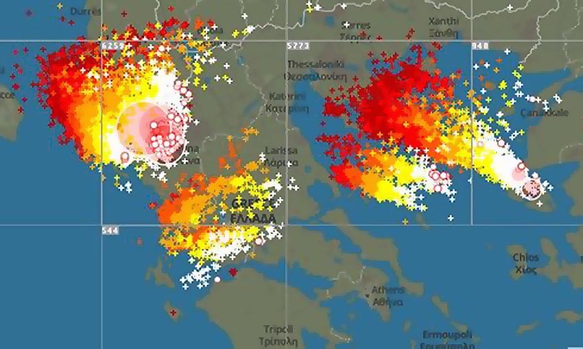Ο τεράστιος όγκος καταιγιδοφόρων νεφών πάνω από το βόρειο Ιόνιο καταγράφηκε από την Εθνική Μετεωρολογική Υπηρεσία, ενώ περισσότεροι από 6.000 κεραυνοί έπεσαν στο βόρειο Αιγαίο από τη Χαλκιδική έως τη Λέσβο.