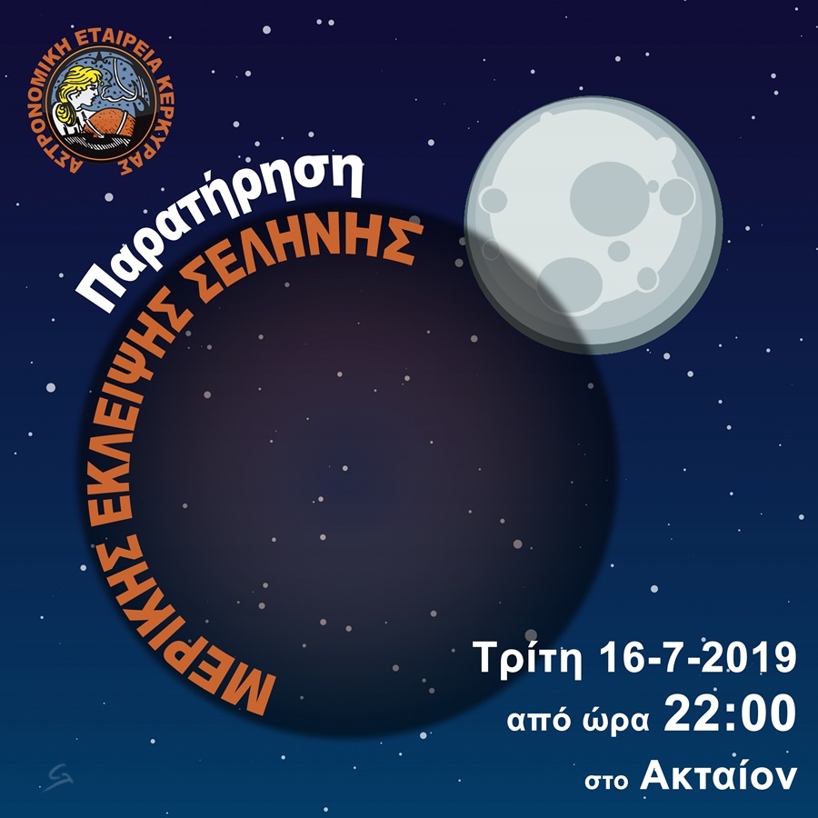Η Αστρονομική Εταιρεία Κέρκυρας διοργανώνει παρατήρηση της μερικής έκλειψης Σελήνης με τηλεσκόπια την Τρίτη 16 Ιουλίου 2019, από τις 22:00 στο Ακταίον,με ελεύθερη συμμετοχή για το κοινό.