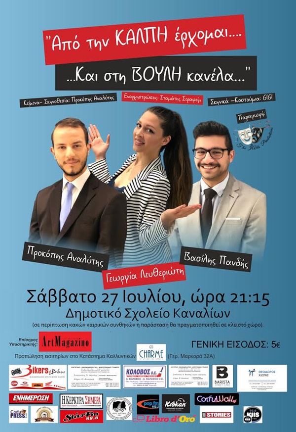 Η πιο αστεία, ή πιο ξεκαρδιστική σατυρική μετ’ εκλογική κωμωδία του καλοκαιριού παρουσιάζεται το Σαββάτο 27 Ιουλίου και ώρα 21:15 στο προαύλιο χώρο του δημοτικού σχολείου Καναλίων.