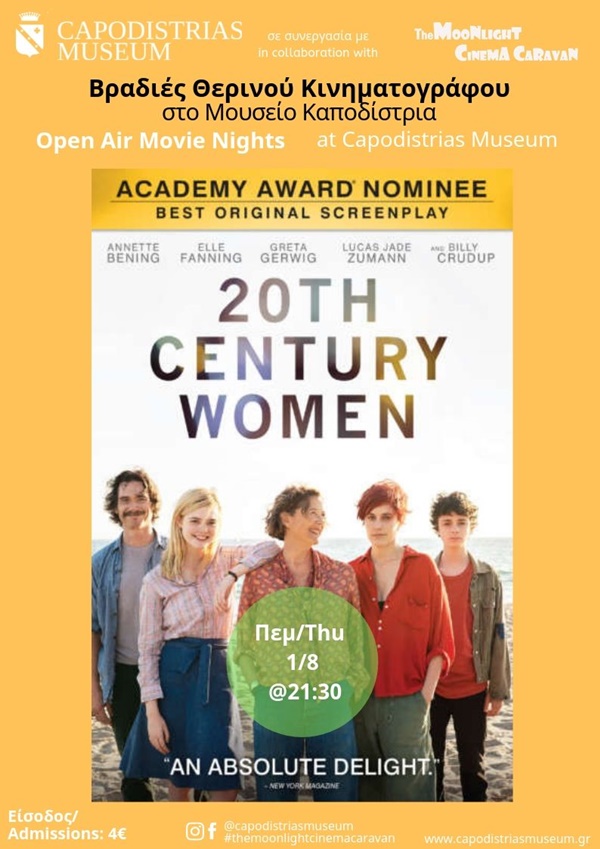 Tην Πέμπτη, 1 Αυγούστου, το Μουσείο Καποδίστρια, σε συνεργασία με την The moonlight cinema caravan, προβάλλει την - υποψήφια για Όσκαρ Καλύτερου Πρωτότυπου Σεναρίου - δραματική κωμωδία "Καταπληκτικές Γυναίκες" (20th Century Women).