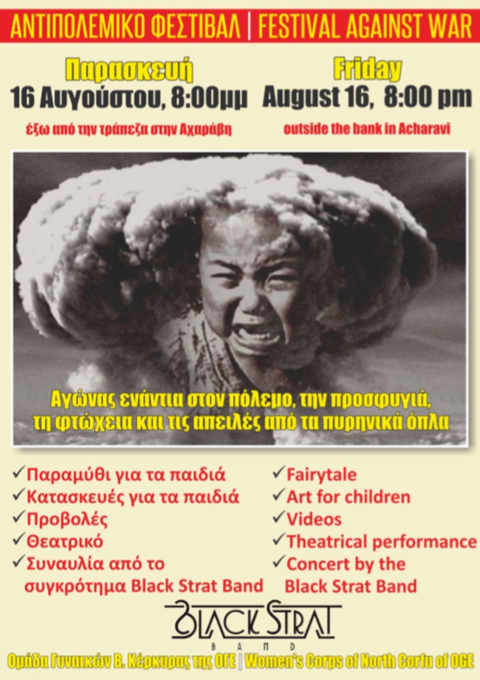 Αντιπολεμικό Φεστιβάλ οργανώνει η Ομάδα Γυναικών Βόρειας Κέρκυρας της ΟΓΕ, με αφορμή την συμπλήρωση 74 χρόνων από το αναίτιο έγκλημα των ΗΠΑ, που ισοπέδωσε τη Χιροσίμα και το Ναγκασάκι στις 6 και 9 Αυγούστου του 1945.