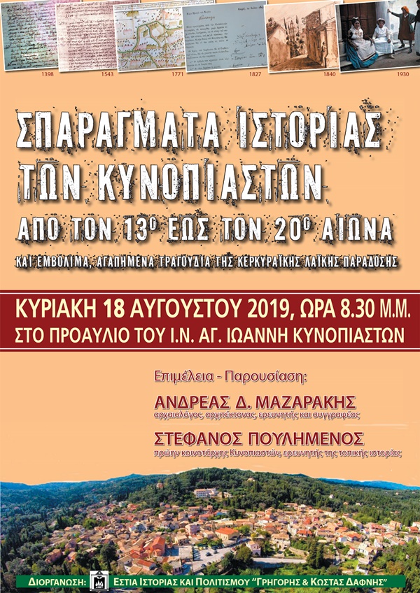 Τέλος, θα προβληθούν στοιχεία που αναδεικνύουν τις βυζαντινές ρίζες των χωριών της Κέρκυρας, ανάμεσα στα οποία και οι Κυνοπιάστες, ενώ για πρώτη φορά θα επιχειρηθεί μια πειστική ερμηνεία του ονόματος του χωριού.