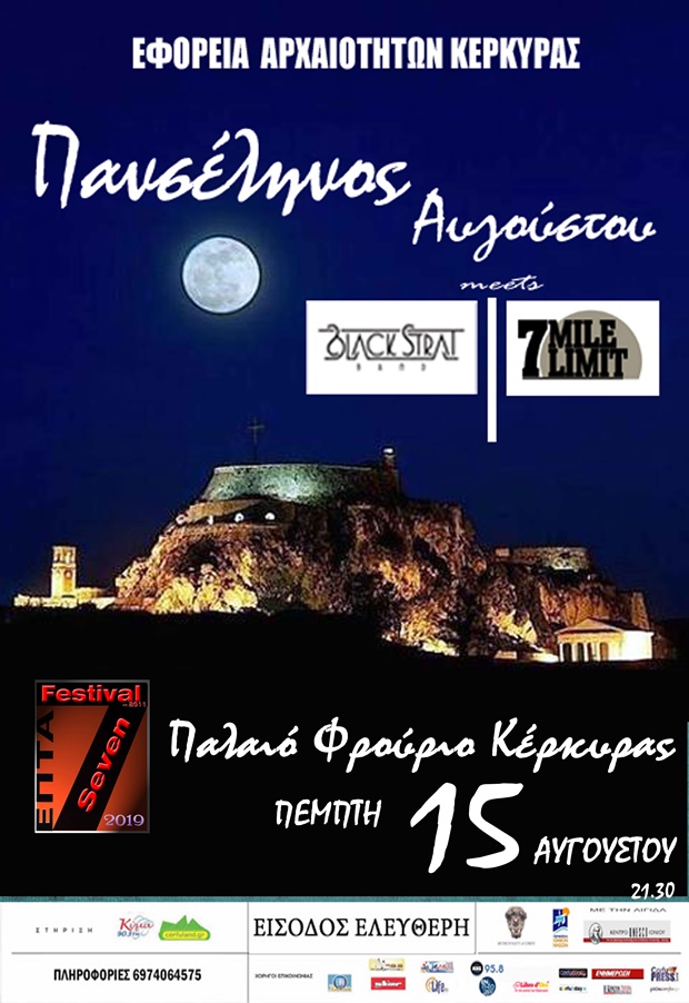 Η Εφορεία Αρχαιοτήτων Κέρκυρας στο πλαίσιο του εορτασμού της Αυγουστιάτικης Πανσελήνου σε αρχαιολογικούς χώρους και μνημεία διοργανώνει, σε συνεργασία με το 9ο SEVEN Festival 2019, συναυλία στο Παλαιό Φρούριο Κέρκυρας.