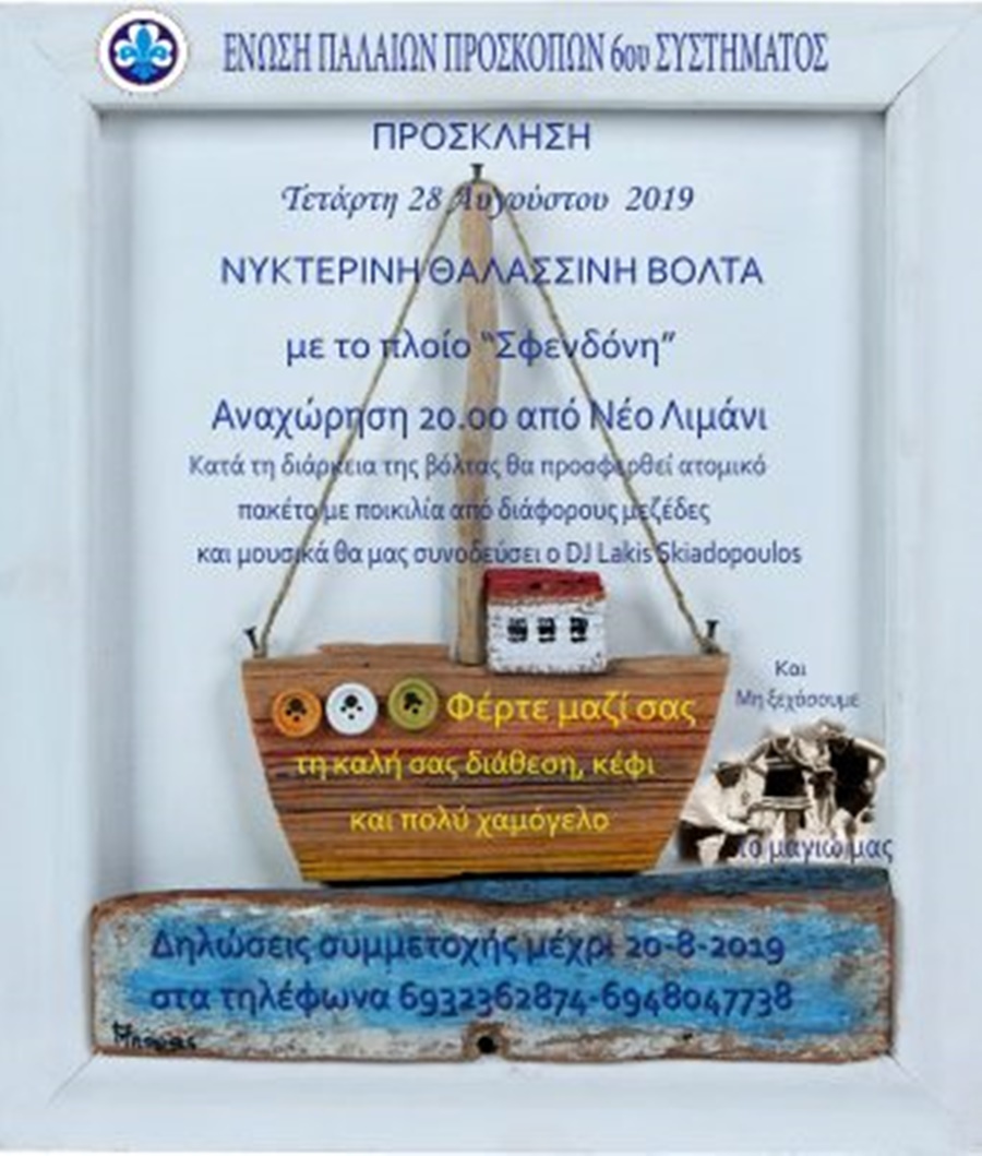 Η Ένωση Παλαιών Προσκόπων του 6ου Συστήματος οργανώνει απόψε το βράδυ, νυκτερινή θαλασσινή βόλτα με το πλοίο Σφενδόνη στις 20.00.