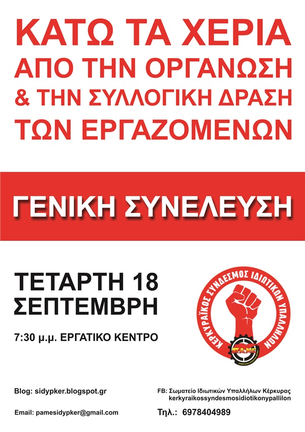 Ο Κερκυραϊκός Σύνδεσμος Ιδιωτικών Υπαλλήλων καλεί σε ΕΚΤΑΚΤΗ ΓΕΝΙΚΗ ΣΥΝΕΛΕΥΣΗ όλα τα μέλη του την Τετάρτη 18 Σεπτέμβρη, στις 7:30 μ.μ. στο Εργατικό Κέντρο Κέρκυρας.