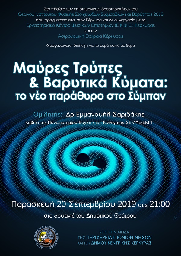 Στο πλαίσιο των επιστημονικών δραστηριοτήτων του Θερινού Ινστιτούτου Φυσικής Στοιχειωδών Σωματιδίων και Βαρύτητας 2019, που πραγματοποιείται στην Κέρκυρα και σε συνεργασία με το Ε.Κ.Φ.Ε. και την Αστρονομική Εταιρεία διοργανώνεται διάλεξη για το ευρύ κοινό με θέμα: «Μαύρες Τρύπες και Βαρυτικά Κύματα: το νέο παράθυρο στο Σύμπαν»