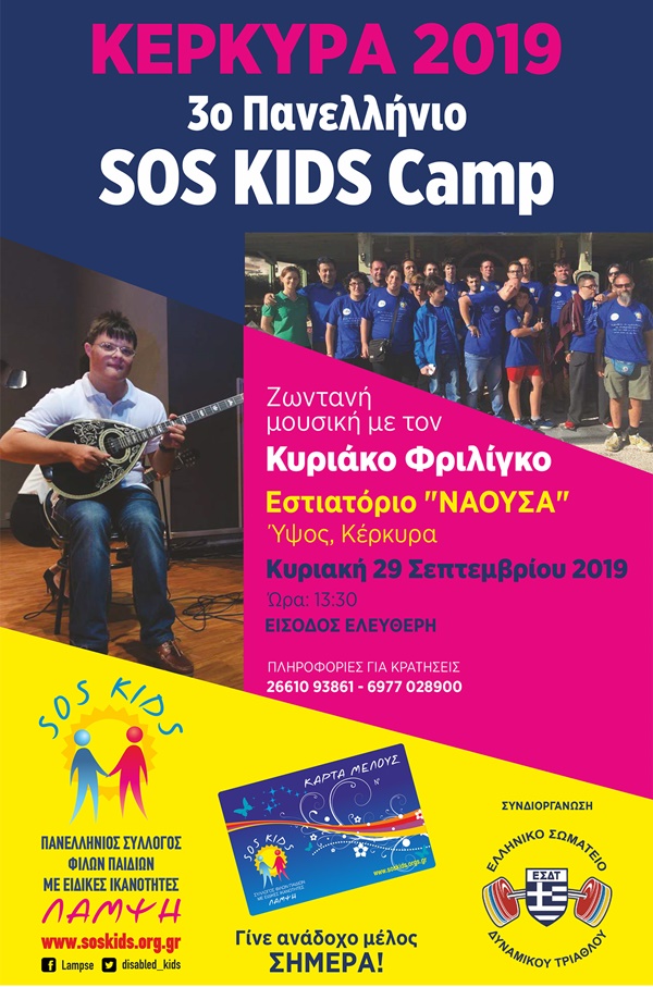 Ο Πανελλήνιος Σύλλογος Φίλων Παιδιών με Ειδικές Ικανότητες SOS KIDS Λάμψη σας προσκαλεί στην εκδήλωση που θα πραγματοποιηθεί την Κυριακή , 29 Σεπτεμβρίου 2019 και ώρα 13:30, στο Εστιατόριο “ΝΑΟΥΣΑ”,στον Ύψο Κέρκυρα τηλ.26610 93861.