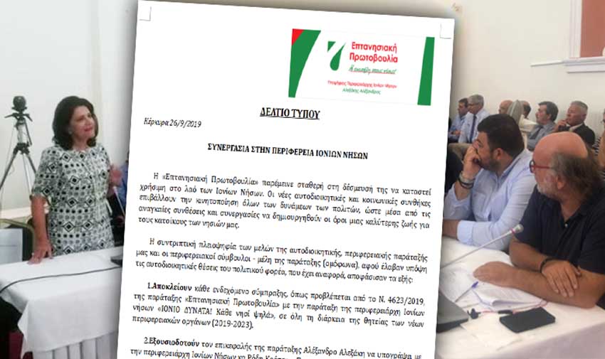 Αντιλαμβανόμαστε την ευθύνη που αναλαμβάνουμε. Εκφράζουμε τη δέσμευση ότι η συνεργασία μας και η θεσμική λειτουργία μας θα έχουν αποκλειστικό κριτήριο το συμφέρον του λαού των Επτανήσων και την κάλυψη των αναγκών του.