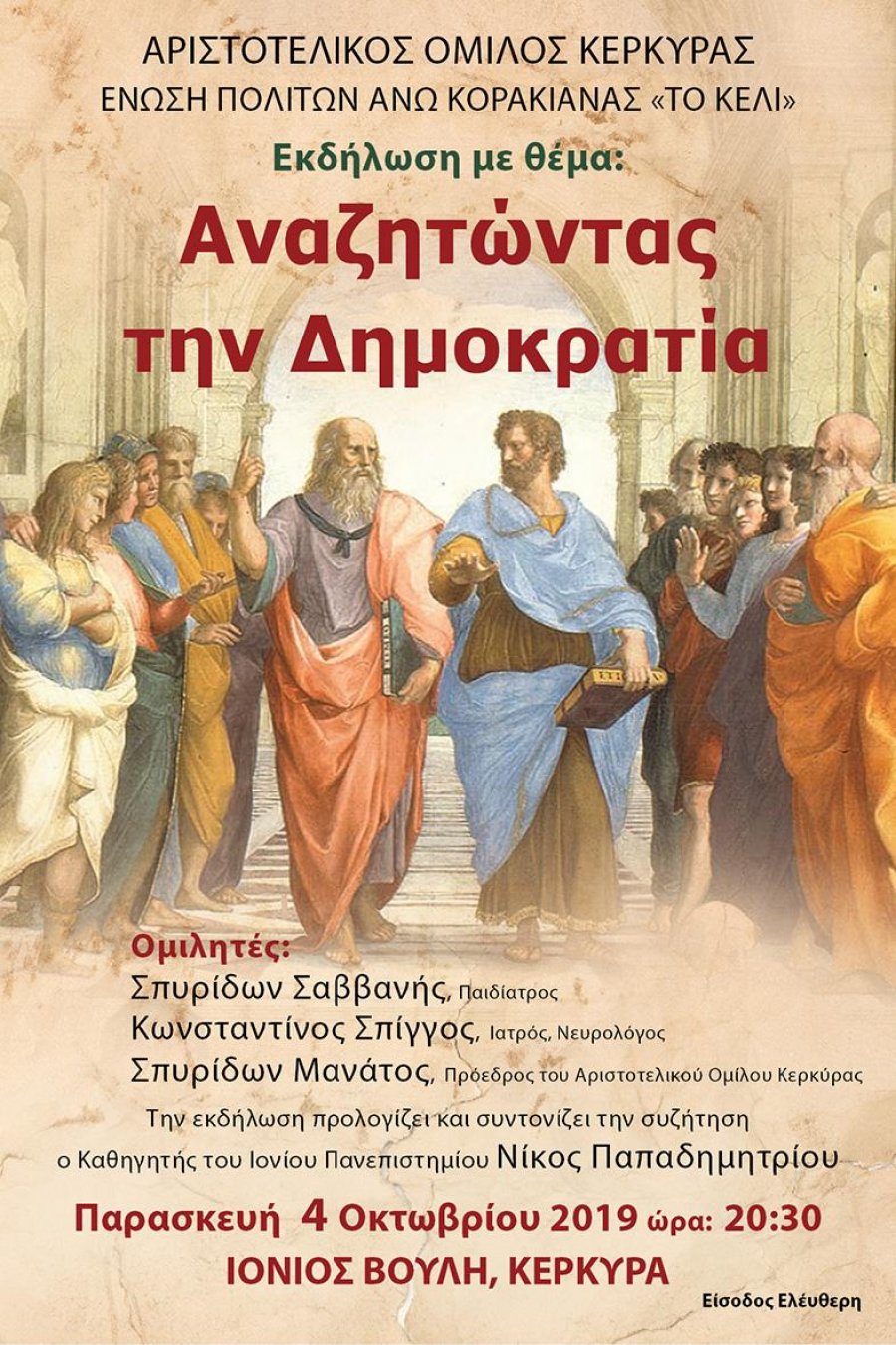 Την Παρασκευή 4 Οκτωβρίου και ώρα 20.30 στην Ιόνιο Βουλή, ο Αριστοτελικός Όμιλος Κέρκυρας και η Ένωση Πολιτών Άνω Κορακιάνας, πραγματοποιούν Εκδήλωση με θέμα: «Αναζητώντας την Δημοκρατία».