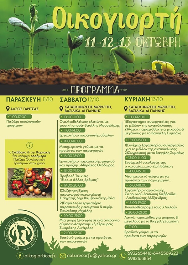 Στα πλαίσια των δραστηριοτήτων του ο Σύλλογος Προστασίας Περιβάλλοντος Κέρκυρας διοργανώνει την 1η Οικογιορτή Κέρκυρας, που θα πραγματοποιηθεί στις 11, 12, και 13 του Οκτώβρη στη νησί μας.