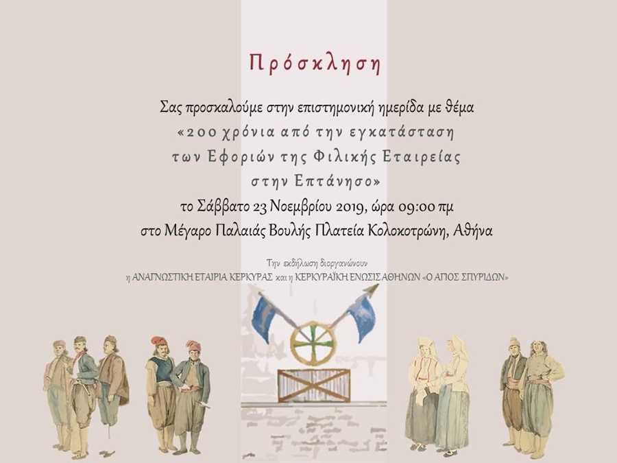 Το Σάββατο, 23 Νοεμβρίου, στην Αθήνα, στο Μέγαρο της Παλαιάς Βουλής, σε συνδιοργάνωση της Αναγνωστικής Εταιρίας Κερκύρας και της Κερκυραϊκής Ένωσης Αθηνών θα πραγματοποιηθεί επιστημονική ημερίδα με θέμα: 200 χρόνια από την εγκατάσταση των Εφοριών της Φιλικής Εταιρείας στην Επτάνησο.