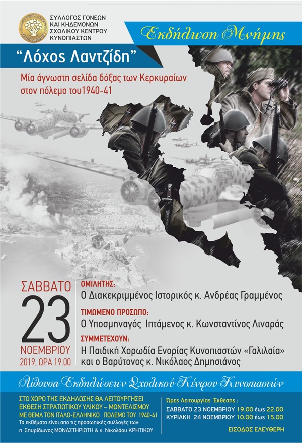 Το Δ.Σ. του Συλλόγου Γονέων & Κηδεμόνων του Σχολικού Κέντρου Κυνοπιαστών διοργανώνει εκδήλωση μνήμης που θα πραγματοποιηθεί το Σάββατο 23 Νοεμβρίου στις 19.00 στην αίθουσα εκδηλώσεων του σχολείου, με θέμα τον “Λόχο Λαντζίδη”.