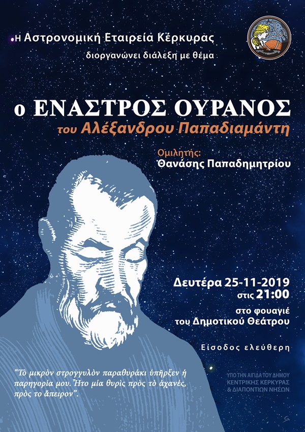 Η Αστρονομική Εταιρεία Κέρκυρας διοργανώνει διάλεξη με θέμα: «Ο Έναστρος Ουρανός του Αλέξανδρου Παπαδιαμάντη»