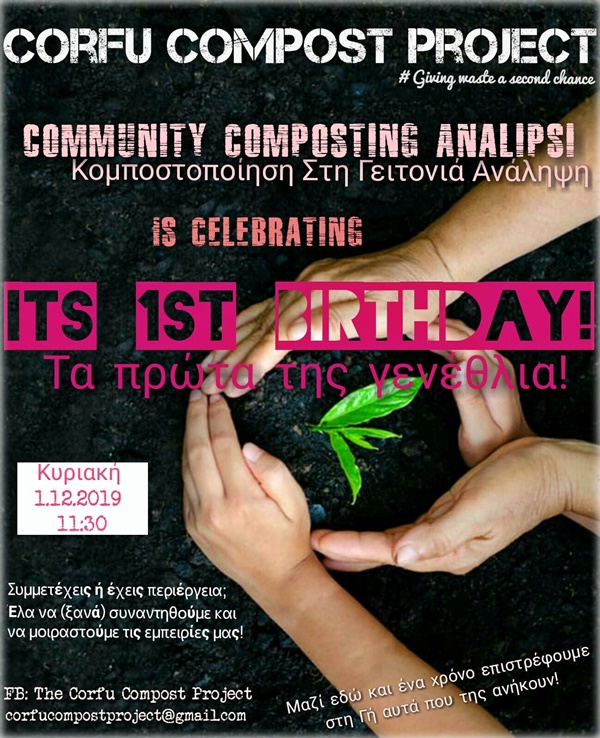 Το Corfu Compost Project ανακοινώνει πως η Κομποστοποίηση στη Γειτονιά Ανάληψη γιορτάζει τα πρώτα της γενέθλια.