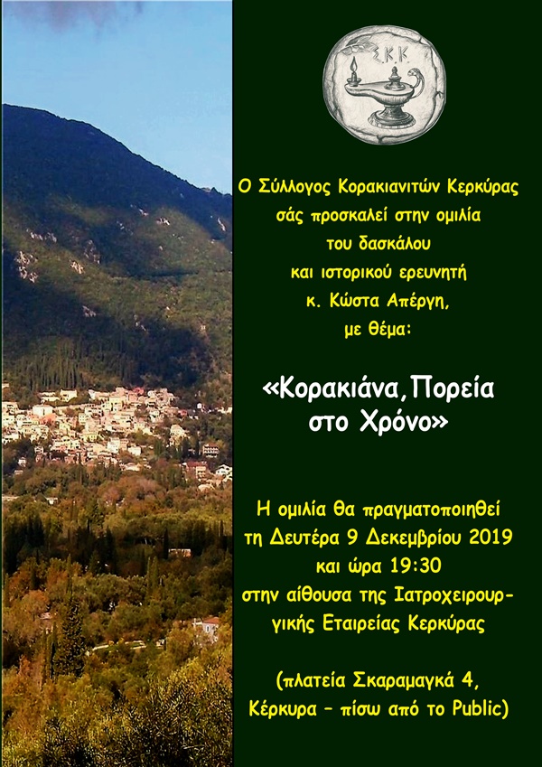Ο Σύλλογος Κορακιανιτών Κέρκυρας διοργανώνει ομιλία του δασκάλου και ιστορικού ερευνητή Κώστα Απέργη με θέμα “Κορακιάνα, πορεία στο χρόνο”.