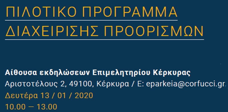 Παρουσίαση μελέτης με θέμα “Πιλοτικό Πρόγραμμα Διαχείρισης Προορισμών (DMOs)” θα πραγματοποιηθεί την Δευτέρα 13 Ιανουαρίου στο Επιμελητήριο Κέρκυρας, υπό την αιγίδα της Περιφέρειας Ιονίων Νήσων.