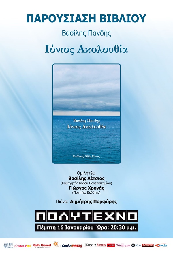 Κυκλοφόρησε από τις εκδόσεις “Οδός Πανός’ το βιβλίο του Βασίλη Πανδή με τίτλο”Ιόνιος Ακολουθία”, μια ποιητική σύνθεση όπου τον κύριο λόγο έχουν η μουσική και η ομορφιά της θάλασσας και των νησιών του Ιονίου, το παρελθόν και το μέλλον του, ο έρωτας και ο θάνατος.