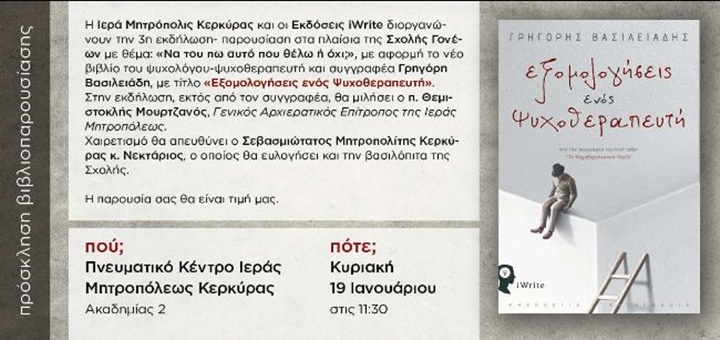 Η Ιερά Μητρόπολις Κερκύρας και οι Εκδόσεις iWrite διοργανώνουν την 3η εκδήλωση- παρουσίαση στο πλαίσιο της Σχολής Γονέων με θέμα “Να του πω αυτό που θέλω ή όχι;”, με αφορμή το νέο βιβλίο του ψυχολόγου-ψυχοθεραπευτή και συγγραφέα Γρηγόρη Βασιλειάδη, με τίτλο “Εξομολογήσεις ενός Ψυχοθεραπευτή”.