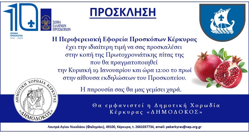 Την Κυριακή 19/1, στις 12 το μεσημέρι στο Προσκοπείο θα πραγματοποιηθεί η Κοπή της Πρωτοχρονιάτικης Πίτας της Περιφερειακής Εφορείας Προσκόπων Κέρκυρας.