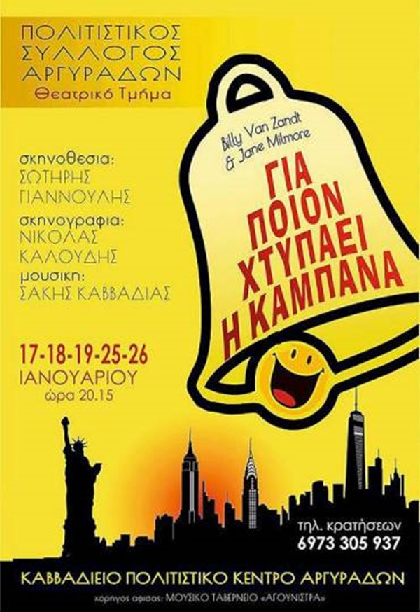 Το Θεατρικό Τμήμα του Πολιτιστικού Συλλόγου Αργυράδων παρουσιάζει το έργο των Billy Van Zandt & Jane Milmore «Για ποιόν χτυπάει η καμπάνα» στο Καββαδίειο Πολιτιστικό Κέντρο Αργυράδων τις ακόλουθες μέρες: Παρασκευή 17/1, Σάββατο 18/1 και Κυριακή 19/1 καθώς και Σαββατοκύριακο 25 & 26/1/2020. Σκηνοθεσία Σωτήρης Γιαννούλης.