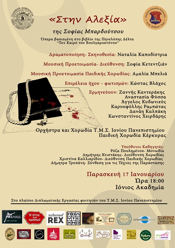την Παρασκευή 17 Ιανουαρίου, ώρα 18:00 στην Ιόνιο Ακαδημία, την όπερα «Στην Αλεξία».