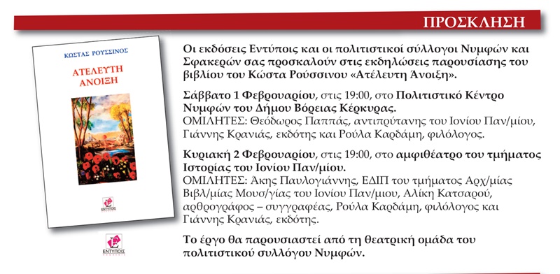 Οι εκδόσεις Εντύποις και οι πολιτιστικοί σύλλογοι Νυμφών και Σφακερών διοργανώνουν εκδηλώσεις παρουσίασης του βιβλίου του Κώστα Ρούσσινου “Ατέλευτη Άνοιξη”.