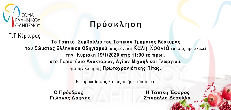 Το τοπικό συμβούλιο του Τοπικού Τμήματος Κέρκυρας του Σώματος Ελληνικού Οδηγισμού διοργανώνει την Κοπή της Πρωτοχρονιάτικης πίτας του.