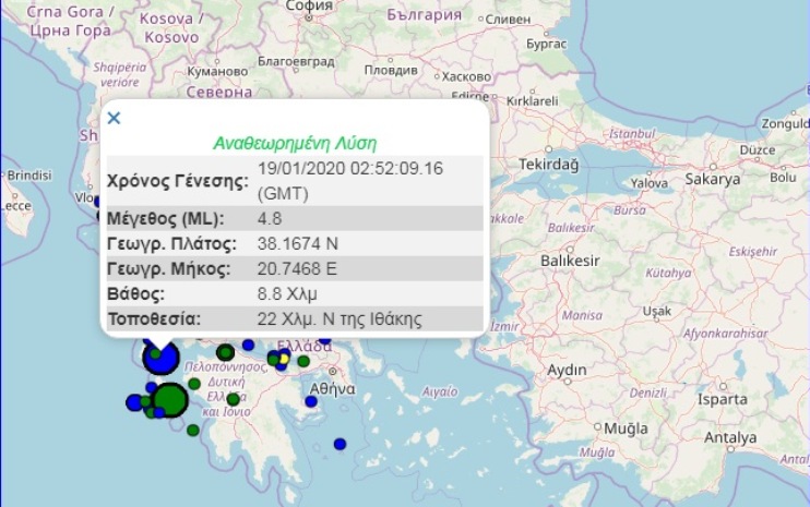 Στο χορό των Ρίχτερ η Κεφαλονιά τα ξημερώματα της Κυριακής 19 Ιανουαρίου 2020. Ισχυρός σεισμός μεγέθους 4,8 Ρίχτερ, σύμφωνα με το Γεωδυναμικό Ινστιτούτο του Εθνικού Αστεροσκοπείου Αθηνών, σημειώθηκε στις 4.52 τα ξημερώματα σε εστιακό βάθος 8,8 χιλιομέτρων στην περιοχή της ΝΑ Κεφαλονιάς.