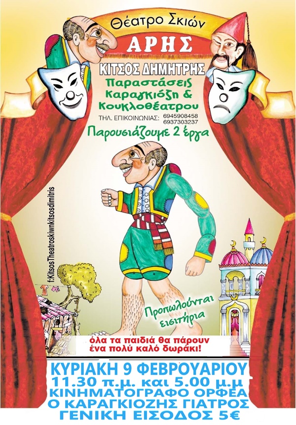 Την Κυριακή 9 Φεβρουαρίου, ο «Θίασος του Άρη» και ο παίκτης θεάτρου σκιών Δημήτρης Κίτσος παρουσιάζουν στην Κέρκυρα, στον κινηματογράφο Ορφέα, παράσταση θεάτρου σκιών και κουκλοθέατρου με τίτλο: «Ο Καραγκιόζης Γιατρός»