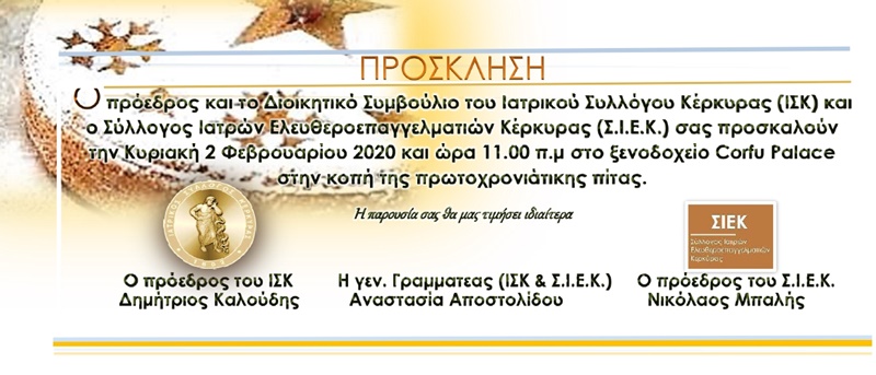 Ο πρόεδρος και το Διοικητικό Συμβούλιο του Ιατρικού Συλλόγου Κέρκυρας (ΙΣΚ) και ο Σύλλογος Ιατρών Ελευθεροεπαγγελματιών Κέρκυρας (Σ.Ι.Ε.Κ.) σας προσκαλούν την Κυριακή 2 Φεβρουαρίου 2020 και ώρα 11.00 π.μ στο ξενοδοχείο Corfu Palace στην κοπή της πρωτοχρονιάτικης πίτας.