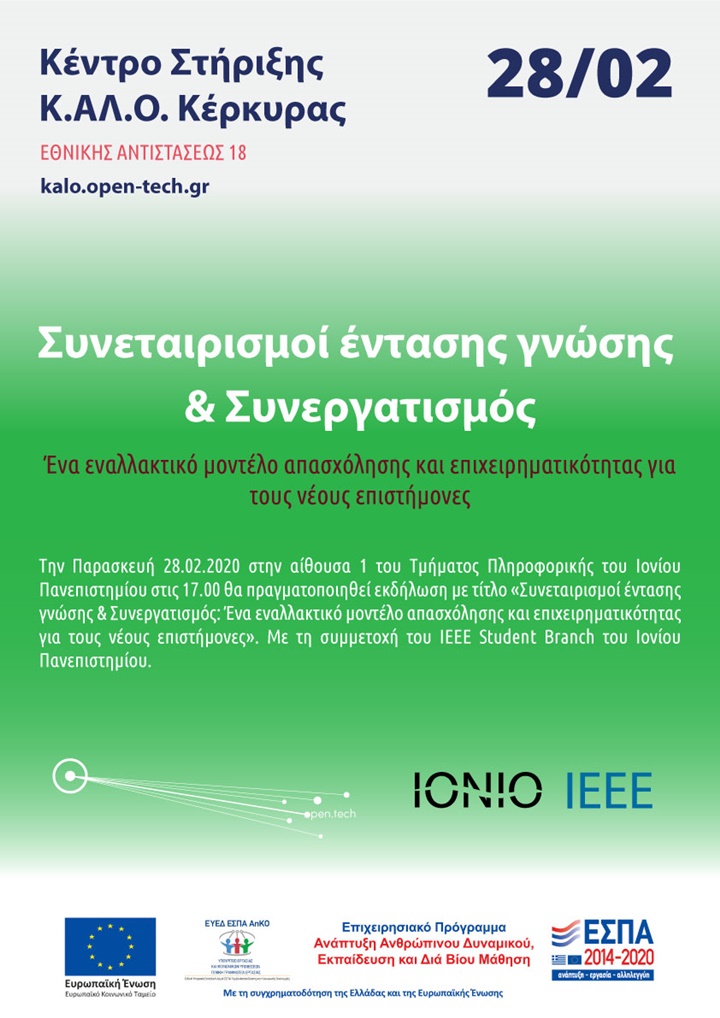 Την Παρασκευή 28 Φεβρουαρίου και ώρα 17.00 στην αίθουσα 1 του Τμήματος Πληροφορικής του Ιονίου Πανεπιστημίου θα πραγματοποιηθεί εκδήλωση με τίτλο: «Συνεταιρισμοί έντασης γνώσης & Συνεργατισμός: ένα εναλλακτικό μοντέλο απασχόλησης και επιχειρηματικότητας για τους νέους επιστήμονες».