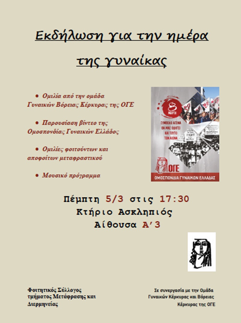 Ο φοιτητικός σύλλογος του τμήματος μετάφρασης και διερμηνείας του Ιονίου Πανεπιστημίου, σε συνεργασία με τις ομάδες γυναικών Κέρκυρας και Βόρειας Κέρκυρας της ΟΓΕ, οργανώνουν εκδήλωση για την παγκόσμια ημέρα της γυναίκας, την Πέμπτη 5/3 στις 5:30μμ, στο πρώην ψυχιατρείο, στο κτήριο Ασκληπιός, στην αίθουσα Α3.