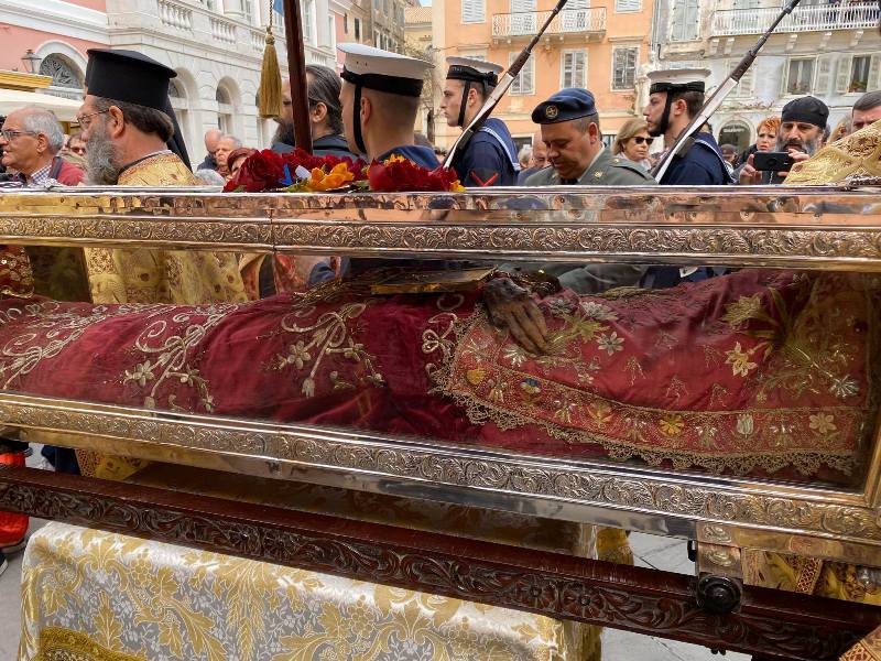 Κατόπιν, με την δέουσα τάξη της κερκυραϊκής παραδόσεως λιτανεύθηκε το ιερό σκήνωμα, μαζί με την θαυματουργή εικόνα της Παναγίας της Δημοσιάνας, ενώ οι ιερείς κρατούσαν στα χέρια τους εικόνες, όπως η ημέρα επιβάλλει.