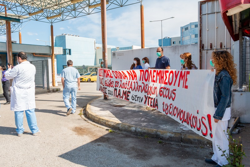 “ΔΩΣΤΕ ΜΑΣ ΟΠΛΑ ΝΑ ΠΟΛΕΜΗΣΟΥΜΕ-Ο ΛΑΟΣ ΣΩΖΕΙ ΤΟΝ ΛΑΟ-ΑΛΛΗΛΕΓΓΥΗ ΣΤΟΥΣ ΥΓΕΙΟΝΟΜΙΚΟΥΣ” ανέγραφε το πανό των δυνάμεων του Π.Α.ΜΕ. στην υγεία. Στις δηλώσεις του ο Πρόεδρος της ΕΓΕΣΥΚ, Μάνος Αντωνάκης, αναφέρθηκε στις τεράστιες ελλείψεις που υπάρχουν σήμερα στα Νοσοκομεία όλης της χώρας. Χαρακτηριστικά ανέφερε ότι το ΓΝΚ που βρίσκεται στο 50% του οργανισμού θα ενισχυθεί με… 0 γιατρούς και 12 νοσηλευτές!