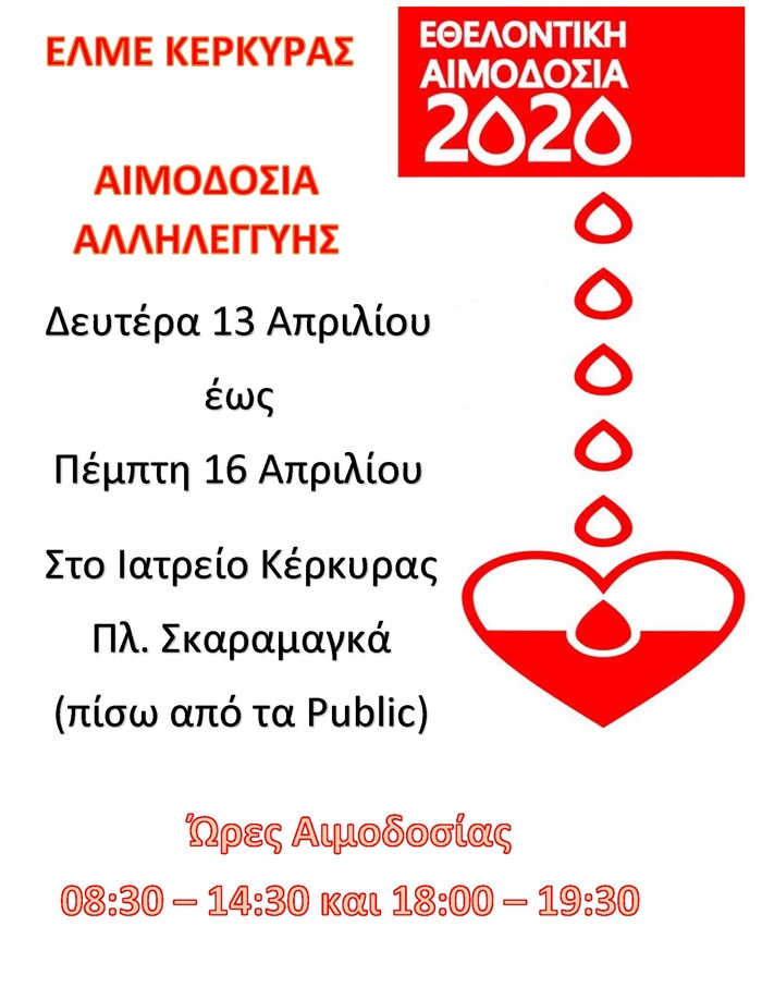 Λόγω των έκτακτων συνθηκών, η αιμοδοσία δεν πραγματοποιείται στο Γ.Ν. Κέρκυρας, αλλά στο Ιατρείο Κέρκυρας (Πλατεία Σκαραμαγκά, πίσω από τα Public). Οι ώρες αιμοδοσίας είναι καθημερινά από τις 8:30 π.μ. – 2:30 μ.μ. και 6 μ.μ. – 7:30 μ.μ. και λόγω των ίδιων συνθηκών, δεν υπάρχει η δυνατότητα από το Γ.Ν.Κ. αποστολής μονάδας για αιμοδοσία σε κάποιο δικό μας χώρο.