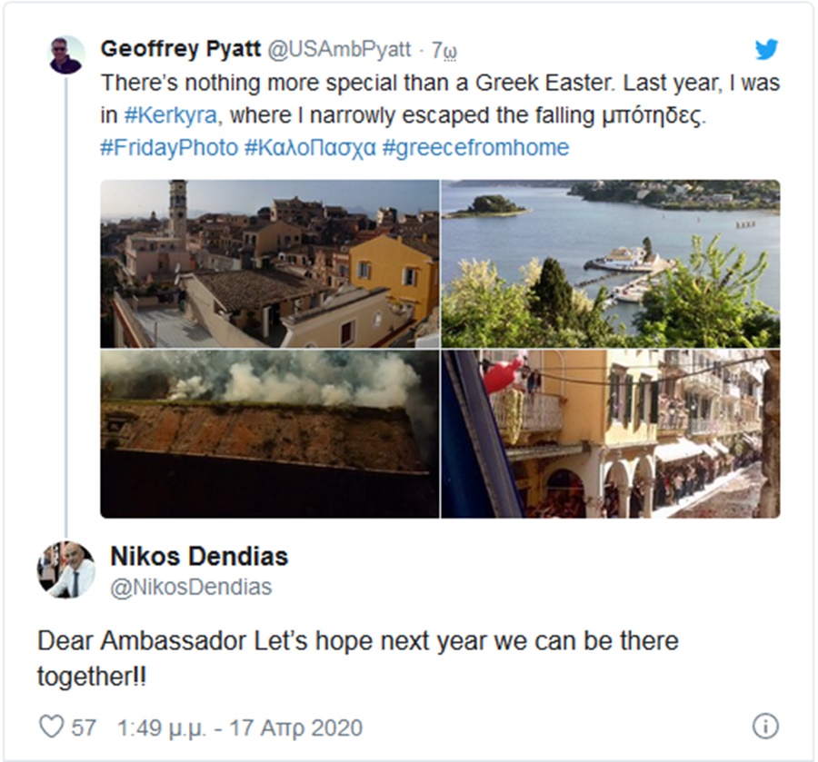«Δεν υπάρχει τίποτα πιο ξεχωριστό από το Ελληνικό Πάσχα», σημείωσε με ανάρτησή του στο twitter ο Αμερικανός πρέσβης στην Ελλάδα Τζέφρι Πάιατ την οποία συνόδευε με πολύ Κέρκυρα, κάτι που έκανε το Νίκο Δένδια να τον προσκαλέσει να ξανάρθει στο νησί του χρόνου.