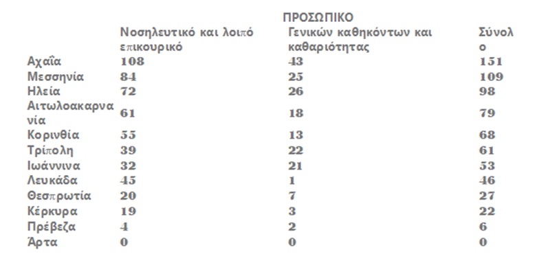 Η ετεροβαρής ενίσχυση των δομών υγείας αποτυπώνεται με σαφήνεια για τις δομές υγείας της Ηπείρου (Ιωάννινα, Θεσπρωτία, Πρέβεζα και Άρτα), όπως επίσης και της Κέρκυρας. Επίσης, το μεγαλύτερο νοσοκομείο της περιοχής, το Πανεπιστημιακό Γενικό Νοσοκομείο Ιωαννίνων υπολείπεται τόσο σε προσλήψεις νοσηλευτικού και λοιπού επικουρικού προσωπικού, όσο και σε προσωπικό γενικών καθηκόντων και καθαριότητας, παρά το γεγονός ότι αποτελεί τη μονάδα αναφοράς για το νέο κορονοϊό.
