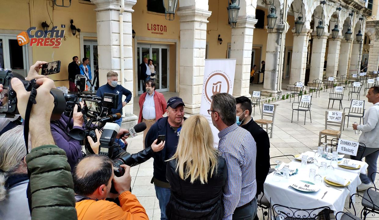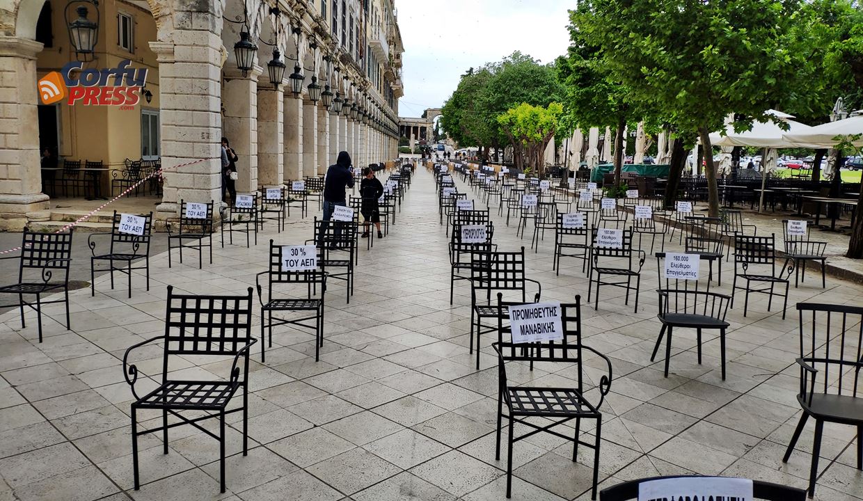 Στο Λιστόν, το Καμπιέλο, την Πόρτα Ρεμούντα, τη Σπηλιά αλλά και σε άλλες πολλές περιοχές της Κέρκυρας και ολόκληρης της Ελλάδας, οι καταστηματάρχες του χώρου της εστίασης έστρωσαν… άδειο τραπέζι και κενές καρέκλες για να δείξουν την αγωνία τους για την επιβίωσή τους εν μέσω της υγειονομικής κρίσης.