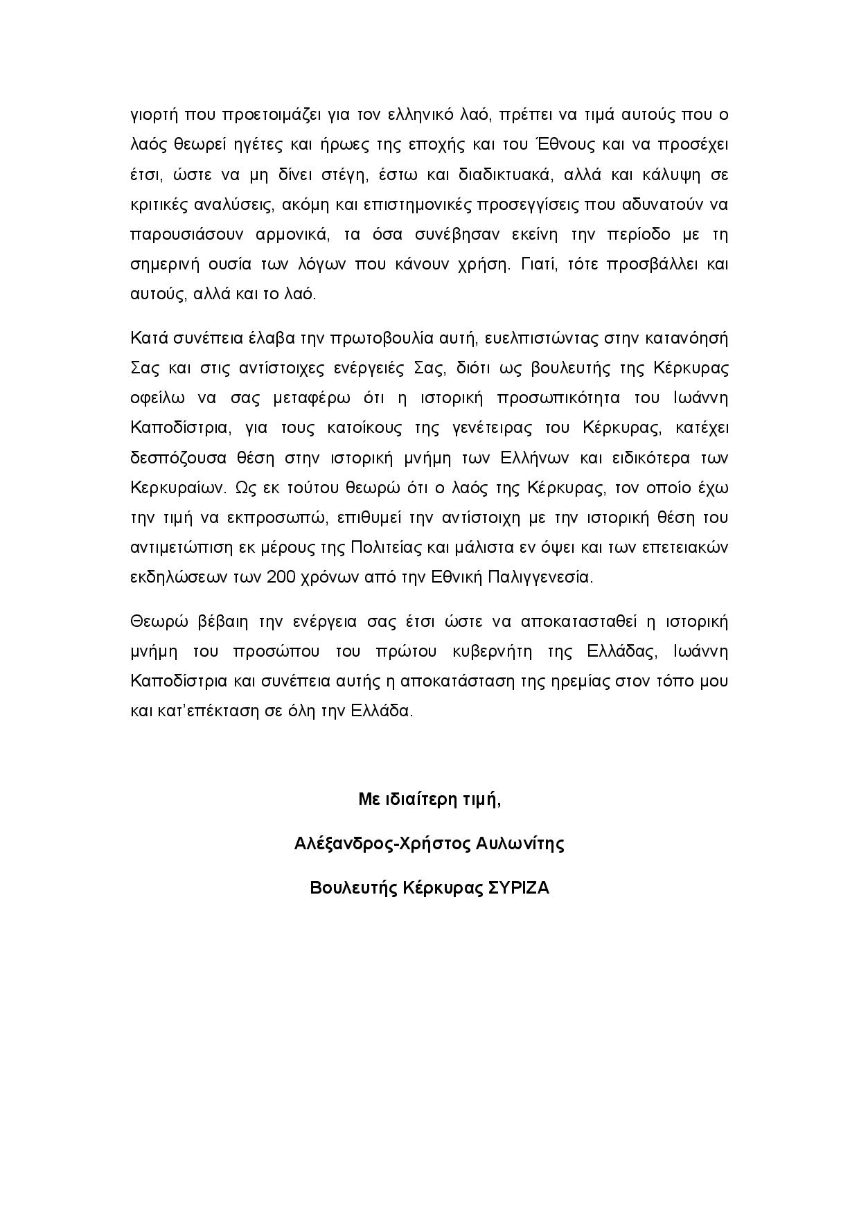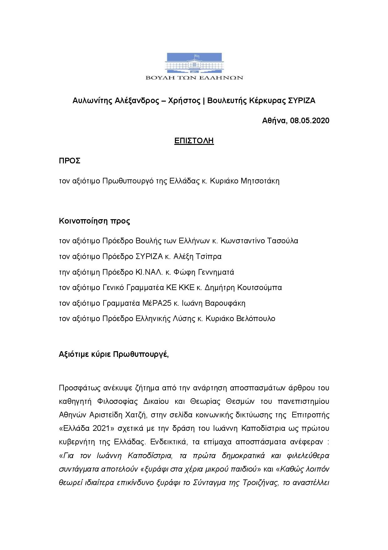 Επιστολή απηύθυνε ο βουλευτής Κέρκυρας του ΣΥΡΙΖΑ, Αλέξανδρος Αυλωνίτης, προς τον Πρωθυπουργό Κυριάκο Μητσοτάκη, αναφορικά με τα ζητήματα που ανέκυψαν από τις αναρτήσεις σχετικά με τον Ιωάννη Καποδίστρια στα μέσα κοινωνικής δικτύωσης της επιτροπής «Ελλάδα 2021».