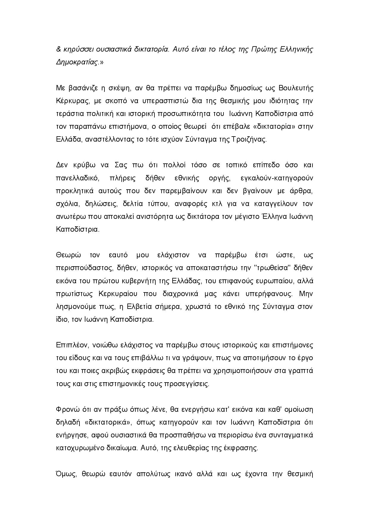 Τέλος, ο Βουλευτής ζήτησε από τον Πρωθυπουργό να γίνουν συγκεκριμένες ενέργειες, ώστε να αποκατασταθεί η ιστορική μνήμη του προσώπου του πρώτου κυβερνήτη της Ελλάδας, Ιωάννη Καποδίστρια και να επανέλθει η ηρεμία στον τόπο μας και κατ’επέκταση σε όλη την Ελλάδα.