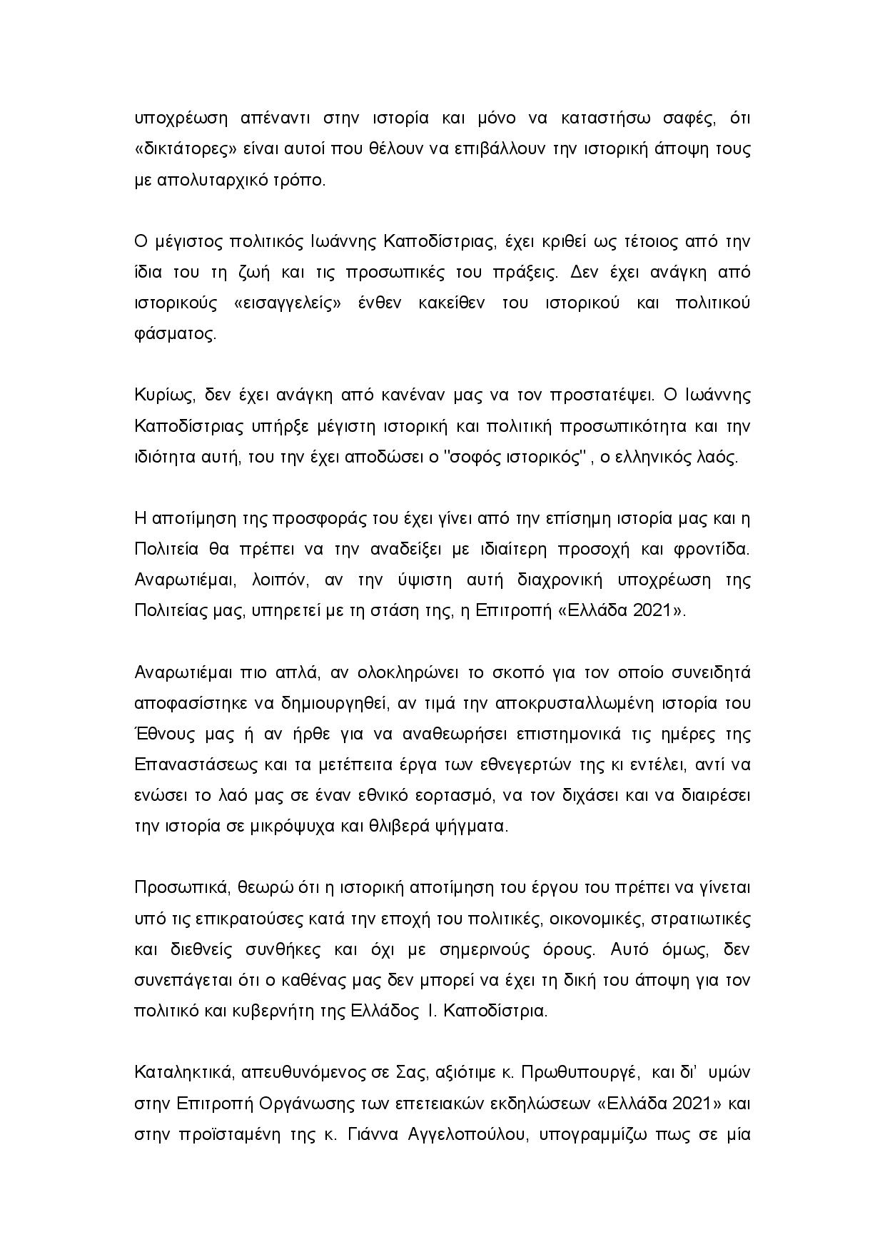 Στην επιστολή του εξέφρασε την έντονη ανησυχία του σχετικά με τις ανωτέρω δηλώσεις, και υπογράμμισε πως η Επιτροπή, σε μία γιορτή που προετοιμάζει για τον ελληνικό λαό, θα πρέπει να τιμά αυτούς που ο λαός θεωρεί ηγέτες και ήρωες της εποχής και του Έθνους και να προσέχει έτσι, ώστε να μη δίνει στέγη, έστω και διαδικτυακά, αλλά και κάλυψη σε κριτικές αναλύσεις, ακόμη και επιστημονικές προσεγγίσεις που αδυνατούν να παρουσιάσουν αρμονικά, τα όσα συνέβησαν εκείνη την περίοδο με τη σημερινή ουσία των λόγων που κάνουν χρήση. Σε διαφορετική περίπτωση, προσβάλλει και αυτούς, αλλά και το λαό.